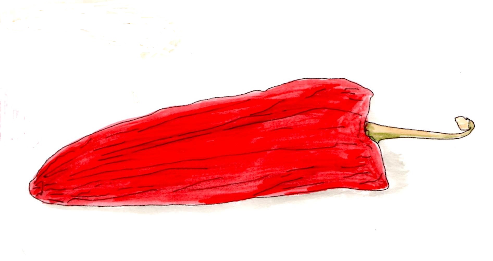 Pointed red pepper. I munch on these all the time on the studio. I have to remember to check in the mirror before I go out. I often have a big clown like red stained smile. This one didn’t get eaten and then I was away for a few days with kid lurgies and stuff. It’s slowly shriveling on my desk in the warm sun. I sometimes ponder on the slowness of certain fruits or veggies to decay and worry about what kind of embalming toxins were added to keep them fresh. I’ll enjoy the slow beauty of decay as I didn’t get to eat this whilst it was crunchy and delicious. This is, I think, the first pointed red pepper to be wasted. We all gobble them up like crazy pepper loving fools.