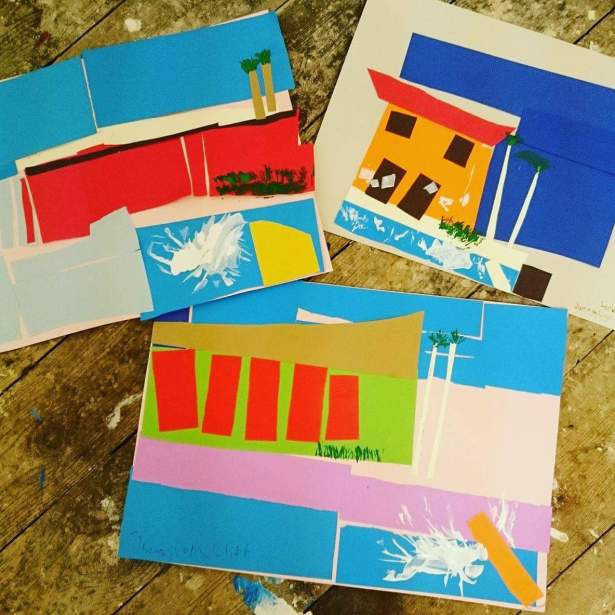 We talked for a while about the flatness of the painting, the presence of a person, the use of shapes, rectangles and lines to create the image and discussed a whole bunch more. Everyone in my art groups has an opinion and they love to share. Both groups worked on the same project today. The first group, aged 5 to 8, set the bar high. Group 2 know that I expect more from them. They’ve been artists longer so why wouldn’t I. Today’s more was straighter lines and strong shapes. Details – looking closer at the painting and adding the finer details to make their work stand out more. Our material for this was collage and paint.
